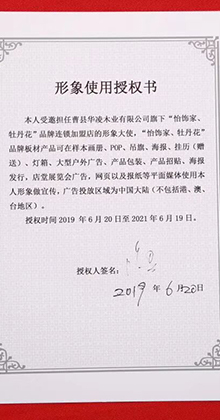 “牡丹花”“怡飾家”品牌是公司主營的注冊商標,并與明星句號達成合作。14年的板材專業精神和持續(xù)穩(wěn)健的行業資源優(yōu)化整合。
